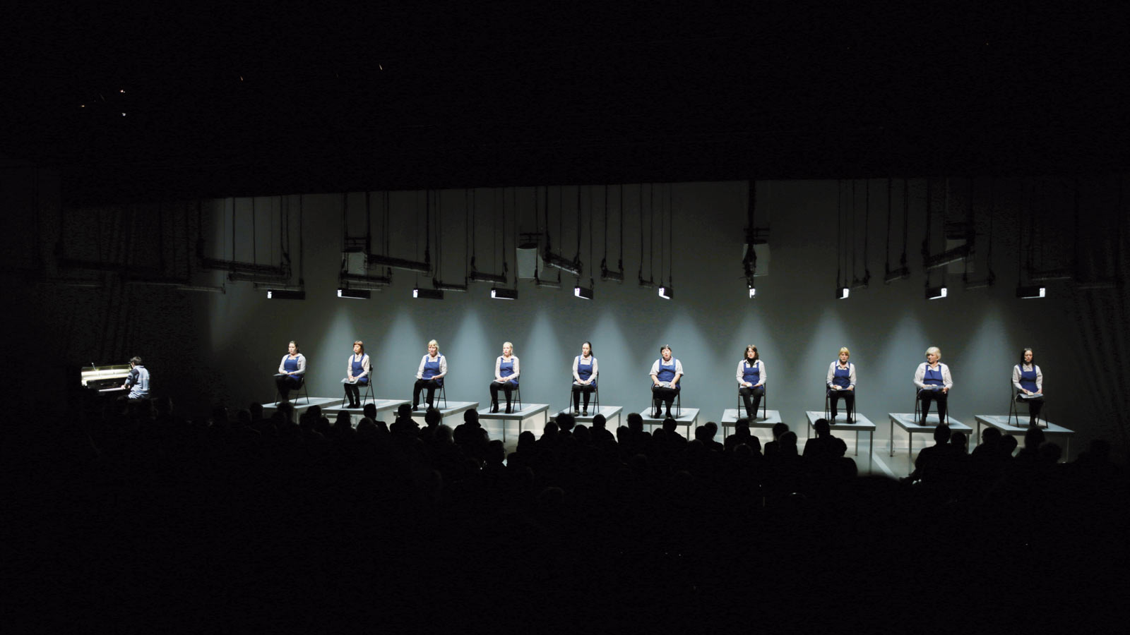 Opera per 10 cassiere, con sottofondo di un centro commerciale e pianoforte